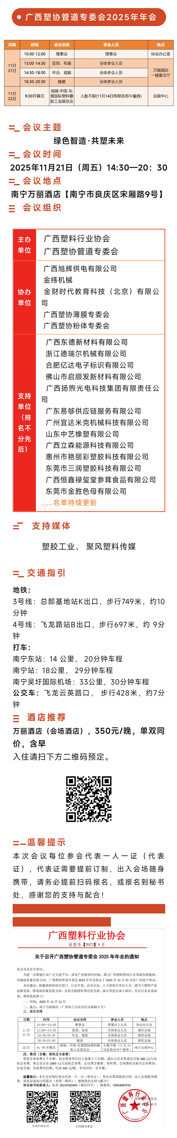 为进一步搭建行业广泛交流平台,深化产业链协同对接,助力广西塑料管道行业突破创新瓶颈、明确高质量发展方向,广西塑协管道专委会 2025年年会拟定于2025年11月21日在广西南宁举办。