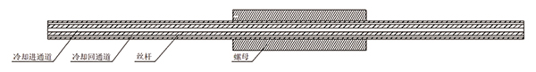 本方式的一种新型丝杆副冷却机构,首先是需要在丝杆中间加工一个冷却进通道,通道不能太大,太大了影响丝杆轴的强度和受力,也不能太小,太小了冷却介子通过量不足,冷却效果不佳。然后在丝杆周边均匀加工若干冷却回通道,这些冷却回通道的单个截面积要小于丝杆的冷却进通道的截面积,但是合起来的截面积要略大于冷却进通道的截面积, 丝杆结构图如图4所示。冷却通道的截面积需要先明确丝杆副运动的工况及要求的丝杆温度和热交换量,然后按照公式Q=m×c×Δt(Q:换热量(kW 或 kJ),m:冷却介子质量流量(kg/s),C:冷却介子的定压比热容,Δt:冷却介子进出口温差(℃)),计算出需要的冷却介子的质量流量,再依据质量流量得出冷却进通道和冷却回通道的截面积。
