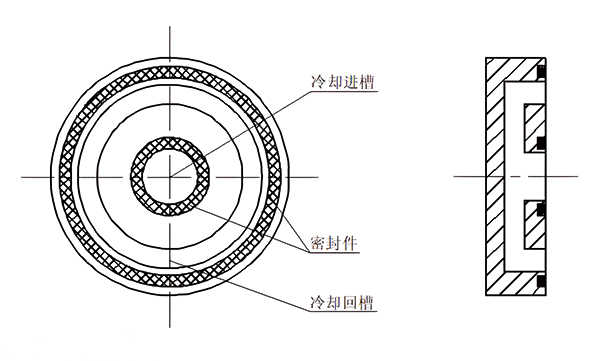 滚珠丝杆的后冷却板结构相对复杂一些,首先,后冷却板的端面需要和丝杆的轴端面配合,后冷却板通过轴承固定在丝杆的轴径上,轴承内径与丝杆轴过盈配合与丝杆一起转动,轴承外圈和后冷却板过盈固定,冷却后板固定后不随丝杆转动;因为后冷却板不随丝杆转动,为了保证冷却回通道和冷却板的冷却回通道联通,在后冷却板上开有冷却回槽和冷却回口,还开有冷却进槽和冷却进口,冷却进槽和丝杆的冷却进通道对接,冷却回槽和丝杆的冷却回通道对接,密封件将冷却进槽和冷却回槽分开,并且防止冷却介子溢出后冷却板。如图7所示。