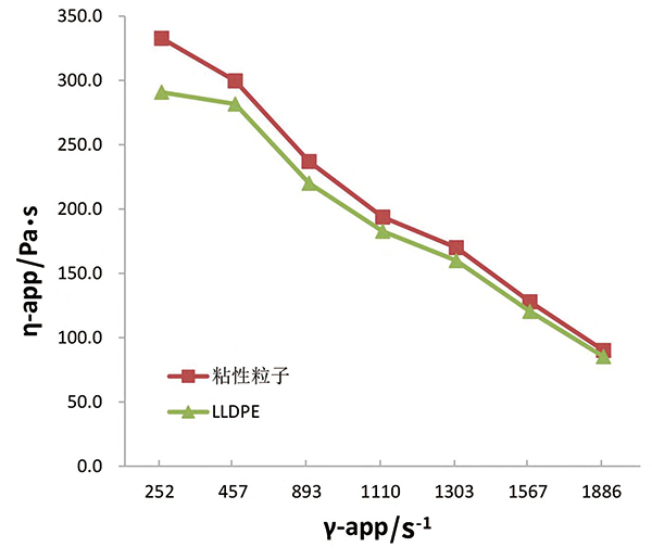 (1)随着配方体系中POE密度从0.857g/cm3增加到0.880g/cm3,黏性粒子的熔指变化不大;硬度从46A增加至70A;密度从0.885g/cm3增加至0.998g/cm3;拉伸断裂强度从3.0MPa增加至12.5MPa;断裂伸长率从750%降低至570%;剥离力从14N/25mm降低到0.7N/25mm。当POE密度为0.863时,综合性能较佳。180℃流变性能测试结果显示黏性粒子黏和行业中常用的吹膜料LLDPE7042的流变性能在460~1800s-1剪切范围内匹配性较好;