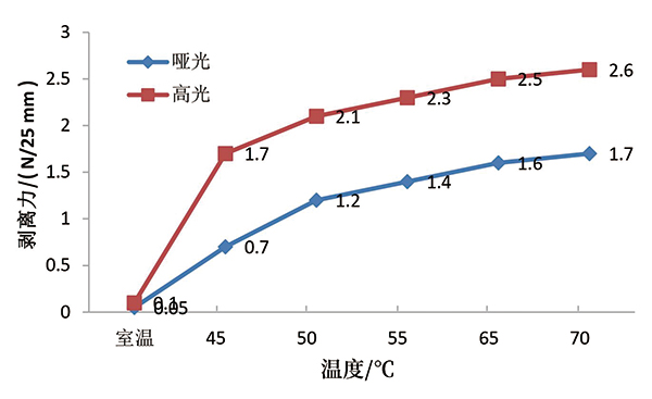 由于保护膜的胶层是热熔胶类型,要在适当的时间内(开放时间),才能得到适当的流动、变形和润湿,因而贴合温度对黏性(剥离力)影响较大。贴膜时基材的表面温度对剥离强度的影响如图2所示:当共挤自黏膜总厚为45μm,胶含量为8%时,随着基材表面温度由室温增加到70℃时,在高光及哑光涂层板上的剥离力基本呈线性增长,温度超65℃后,剥离力增长幅度明显放缓。