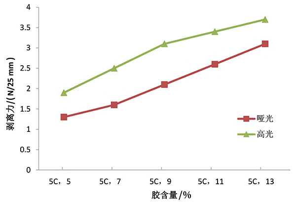 (3)随着胶含量从5%增加13%时,保护膜在高光和哑光板上的剥离力基本呈线性增加,分别从1.9N/25mm增至3.7N/25mm和从1.3N/25mm增至3.1N/25mm,增加95%和138%,在哑光板上比高光板上的上升率更高;