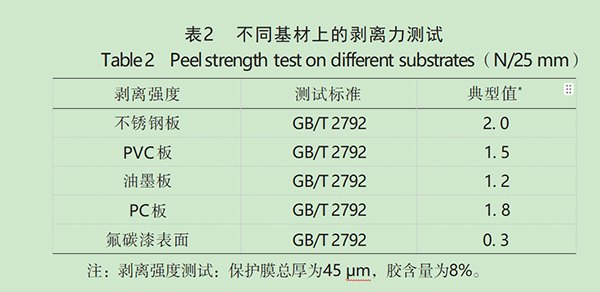 (4)所制保护膜对不锈钢板,PVC板,玻璃,油墨板和PC板等不同基材都有较好的黏性保护作用;在开卷层加入2%开卷母粒,能有效降低保护膜的开卷力,采用黑白膜作为背层,户外耐候及耐热残胶性能较好。