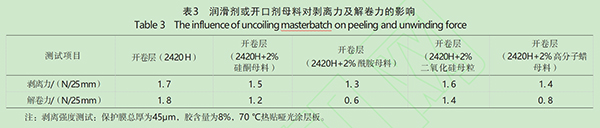 Table3 The influence of uncoiling masterbatch on peeling and unwinding force
