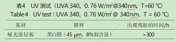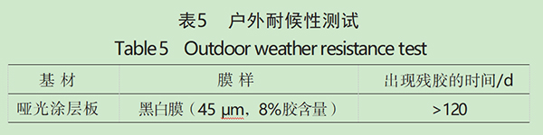 黏接材料作为保护膜的关键材料,其老化性能对保护膜使用寿命显然会产生影响。黏接树脂在加工、成膜过程中均经历熔融受热过程,使用过程中受紫外光,湿气,温度和盐雾等气候影响保护膜使用寿命。黏接材料老化后,大分子链会断裂,平均分子量降低,内聚强度会随之降低,进而会发生内聚破坏或胶与背层脱离,产生遗胶现象[3]。因此,黏接材料在配方设计过程必须考虑耐老化行为。表4和表5分别是保护膜(黑白)的UV加速老化和户外耐候性测试结果,黑白膜的耐UV老化残胶性较好,户外测试也显示出一致的结果。表6为膜的耐热测试结果,75℃/3d条件下无析出和残胶。