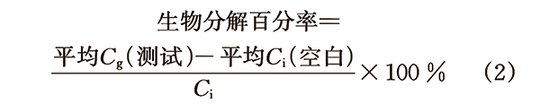 试验体系信息:①试验在(52±2)℃的恒温、弱光条件下,于2L的试验体系中进行。②接种物来源:自制厌氧消化堆肥,肥龄4个月。使用前在52℃条件下培养7天。③阳性控制微晶纤维素分子式:(C6H10O5)n,分子量:(162.14)n,性状:白色粉末。④测试方法模拟最佳高固体含量的强烈厌氧消化环境,在试验中通过连续监测、定期测量反应容器内生物气体的体积和含量来计算生物气体的累计产量,测试样品中每一摩尔(12mg)有机碳可以转化为1mol气态甲烷或二氧化碳,或两者兼有,在标准温度和压力下,产生的一摩尔气体为22.4mL,通过气体产生量计算容器中生成的碳含量,测试公式如式(2)所示:
