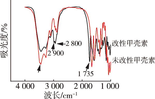 对改性前后的甲壳素进行FTIR测试,由图4可知,3450cm-1处的H—O的伸缩振动峰在改性后减弱,说明改性甲壳素的—OH含量减少,羟基中的H被取代。在2900cm-1、2800cm-1处为—CH3和—CH2—的C—H伸缩振动吸收峰,改性甲壳素较未改性甲壳素的吸收峰明显增加,说明C—H含量增加,也就是甲基和亚甲基含量增加。此外,在1735cm-1处新增了一个吸收峰,为C=O—O酯基伸缩振动峰,由此可以看出,丙烯酸乙酯成功接枝到了甲壳素上[23]。
