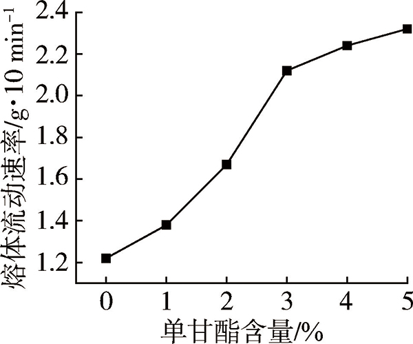 图8 单甘酯的添加对聚丙烯/改性甲壳素厌氧降解助剂熔体流动速率的影响