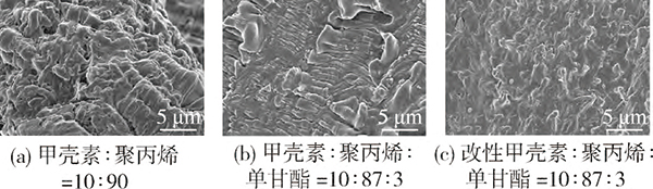 图9为甲壳素含量为10%的厌氧生物降解助剂脆断面的SEM照片。由图9可知,未添加单甘酯的聚丙烯/甲壳素厌氧生物降解助剂,甲壳素在聚丙烯中的分散不均匀,出现较多的团聚,添加了3%单甘酯后,甲壳素的分散要优于前者,但依然少量团聚,而添加3%单甘酯的聚丙烯/改性甲壳素厌氧生物降解助剂,改性甲壳素在聚丙烯中的分散要好于前两者。这是由于单甘酯同时含有脂肪酸链与羟基,单甘酯中的羟基与改性甲壳素的羟基/氨基可形成氢键或范德华力,增强界面结合,单甘酯的脂肪酸链与聚丙烯的碳链形成物理纠缠,降低聚丙烯分子链间的界面张力,降低表面能,促进改性甲壳素在聚丙烯基体中的分散,减少团聚。另一方面,改性甲壳素中甲基、亚甲基含量的增加,进一步加强了改性甲壳素与聚丙烯的相容性,因此,改性甲壳素在单甘酯的协同作用下,在聚丙烯中的分散效果更好。后续以表1中配比8制备的厌氧降解助剂添加至薄膜中进行进一步实验。