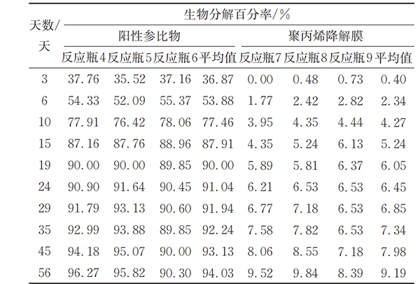 图13 阳性控制和聚丙烯降解膜平均生物分解百分率-时间曲线