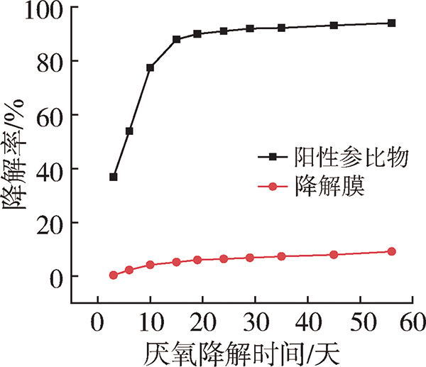 厌氧降解试验结果有效性分析:(1)阳性控制组29天的生物分解率为91.79%、93.13%和90.6%,平均值为91.94%,符合30天内阳性控制生物分解百分率大于70%的要求;(2)试验56天时阳性控制组反应容器内生物分解百分率与平均值之间的偏差分别为2.38%、1.9%和4.13%,均不超过20%。