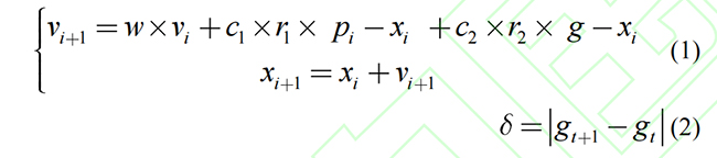 式中:i1,2,N,N—此种群粒子的总数。vi—粒子速度,xi—粒子的当前位置,r1,r2—(0,1)之间的随机数,c1,c2—速度系数,w—惯性因子,w越大全局搜索能力越好,越小局部搜索能力越好,δ—迭代后群体最优结果与上一次的最优值之差的绝对值,n—迭代步数。