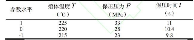 将扩展后的变量分别设置为水平1和水平-1,原变量为水平0。如,初始工艺参数组合为熔体温度220℃、保压压力28MPa和保压时间10.4s。通过该方法得到下一次迭代的参数水平如表4所列。