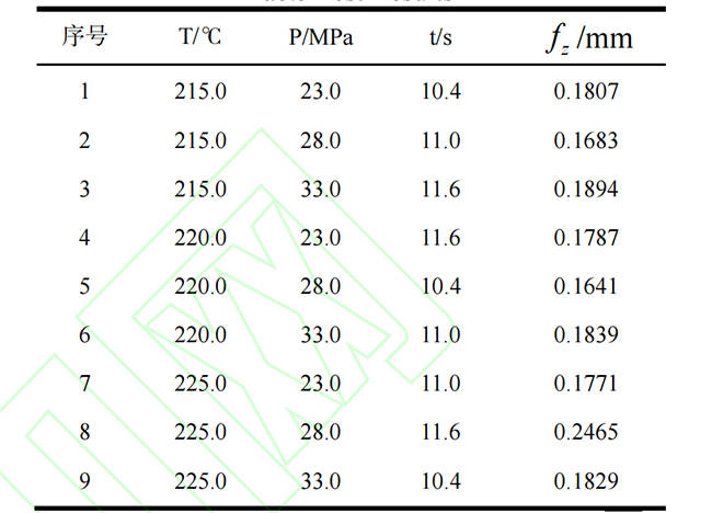 由3因素3个水平,确定一个有9行4列的L934正交表。其中,工艺参数熔体温度、保压压力和保压时间分别设置在第1、2、4列,第3列为空列,没有工艺参数与之对应,对结果没有影响,因此忽略。