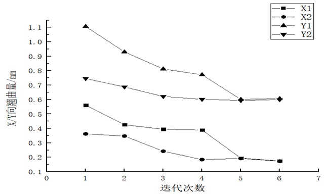 同时,统计迭代过程模型在X方向和Y方向上的翘曲变形量的上下限值,取绝对值求平均,得到如图5所示,X/Y方向上迭代过程中翘曲的变化情况。Z向翘曲变形降低的同时,X向和Y向的翘曲量也随之下降的图形。说明整体的翘曲变形也得到了优化,且效果显著。