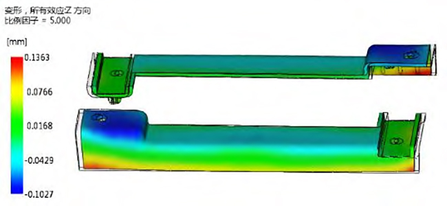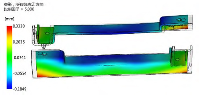 如图6和图7所示,分别为优化前后仿真和实际生产的Z方向的翘曲变形结果。优化前零件存在明显的翘曲变形,优化后翘曲变形得到改善,效果明显,说明该方法可用于实际生产。