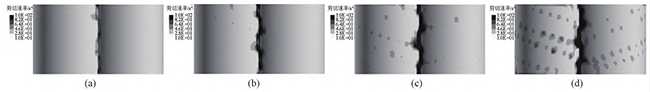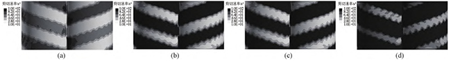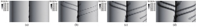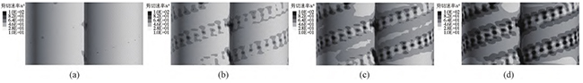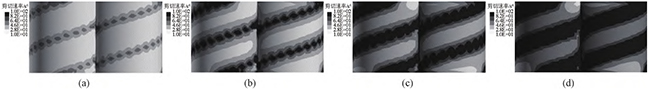 图4无滑移时,不同螺杆转速下,同向双螺杆挤出过程中的流道内剪切速率云图