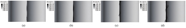 图16壁面滑移时,不同螺杆转速下,异向双螺杆挤出过程中的流道内剪切速率云图