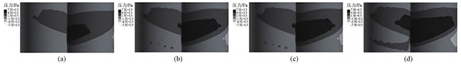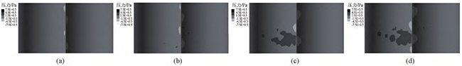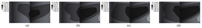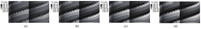 图15壁面滑移时,不同螺杆转速下,异向双螺杆挤出过程中的流道内压力云图