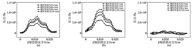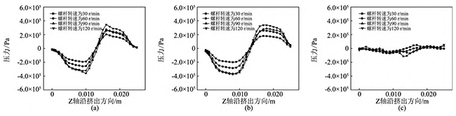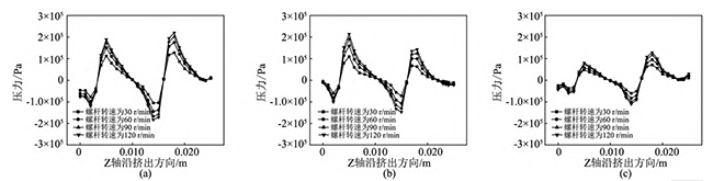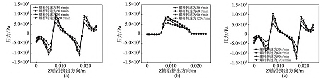 图19不同螺杆转速下,异向双螺杆挤出过程中,流道内螺杆与机筒间隙处的压力变化曲线