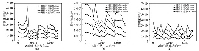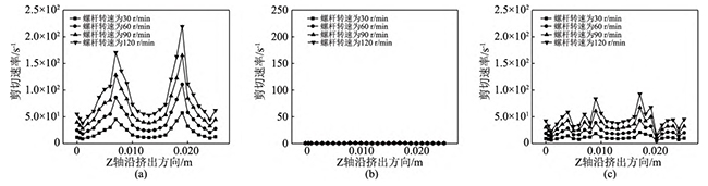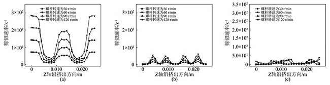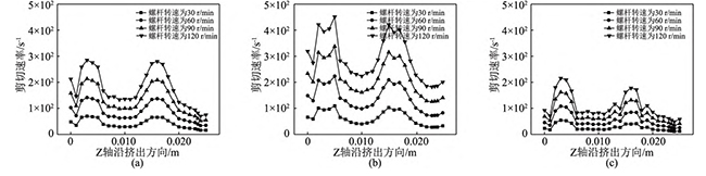 图11不同螺杆转速下,同向双螺杆挤出过程中,流道内螺杆与机筒间隙处的剪切速率变化曲线