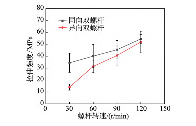 图25 不同双螺杆挤出机挤出物料的拉伸性能