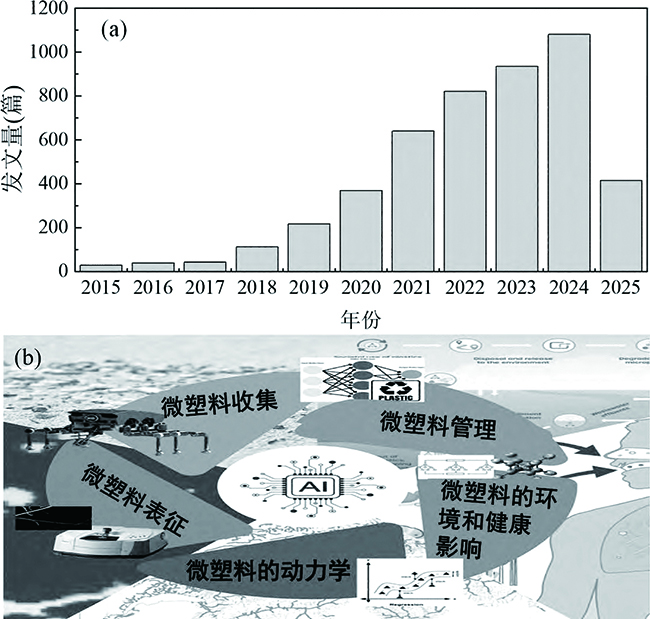 近年来,人工智能(AI)技术迅猛发展,并在环境领域展现出日益广泛的应用前景。AI技术,尤其是机器学习和计算机视觉,正在显著提升我们对环境介质中MPs污染的认知水平[57]。这些先进的计算方法,极大地促进了对海量数据集的高效处理,提高了MPs识别的准确性,并能揭示以往难以发现的分布模式。而以“AI”or“artificialintelligence”or“machinelearning”and“microplastics”or“MPs”为检索词,在WebofScience数据库上对近十年环境领域的研究性论文进行检索,发现随着AI技术的发展,其应用于MPs方面的发文量增长迅速,由2016年的39篇增长至2024年的1081篇(图1(a))。对相关文献进行文献计量学分析发现,近年来相关研究热点,AI技术的应用逐步从MPs污染预测转向MPs污染治理研究。此外,已有研究表明,AI技术还可用于评估MPs、污染的收集、特征描述、动态建模、环境和健康影响评估以及有效管理等全生命周期,从而为制定更有效的管理策略提供科学依据(图1(b))[8]。总之,AI技术凭借强大的数据处理、模式识别和预测能力,为解决MPs污染治理难题提供了新的思路和方法,相关研究成果不断涌现。然而,目前仍缺乏对该领域AI应用现状的系统性综述。