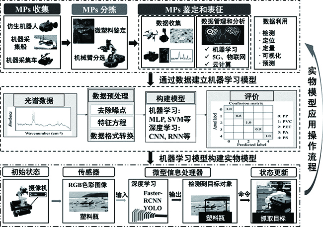 图2展示了MPs通过AI技术采集及分析的操作流程。首先,利用仿生机器人、机器采集船和机器采集车等进行MPs收集。接着,通过机械臂分选进行MPs鉴定。在鉴定和表征环节,设备获取图像等数据,并运用机器学习、5G、物联网和云计算技术进行数据管理和分析,实现MPs的检测、定位、定量、可视化和预测。数据分析中,对光谱数据预处理后,构建机器学习(如MLP(多层感知机)、SVM(支持向量机)等)和深度学习模型(如CNN(卷积神经网络)、RNN(循环神经网络)等),并利用混淆矩阵评价模型效果。实物模型应用操作流程从初始状态的摄像机开始,传感器获取RGB色彩图像输入微型信息处理器,经深度学习算法(Faster-RCNN、YOLO)检测目标对象,发出命令实现状态更新,抓取目标,最终实现机器学习模型构建实物模型的闭环。整个流程体现了AI技术在MPs研究中从采集到分析再到模型构建及应用的系统性和科学性[11]。Hertog等[12]构建了一个基于地理聚类和动态规划算法终点值的有效搜索算法,该算法可实时优化海洋中塑料收集船的行驶路径,在一年的收集实践中,优化的路线将收集的塑料数量增加了60%以上。