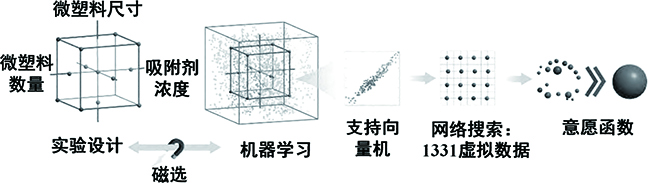 AI技术在MPs污染治理领域具有广阔的发展前景[40-43]。例如,有研究通过结合生物物理建模、分子动力学模拟、量子计算和PPO(近端策略优化)强化学习算法来发现能够与塑料结合的肽,以创建基于生物的工具来对抗MPs污染。有研究采用AI技术优化实验条件,实现改性介孔磁性二氧化硅纳米颗粒对水体中的MPs和有机污染物的高效去除(图5),并对比了SVM、DF和RF三种模型预测的准确性,发现SVM模型表现最佳(R2为0.88)[44].