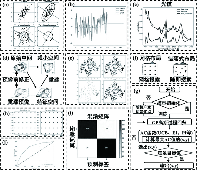 (a)归一化;(b)平滑化;(c)基线校正;(d)PCA降维;(e)数据过采样和欠采样;(f)随机搜索法;(g)网格搜索法;(h)贝叶斯优化法;(i)混淆矩阵;(j)Roc曲线