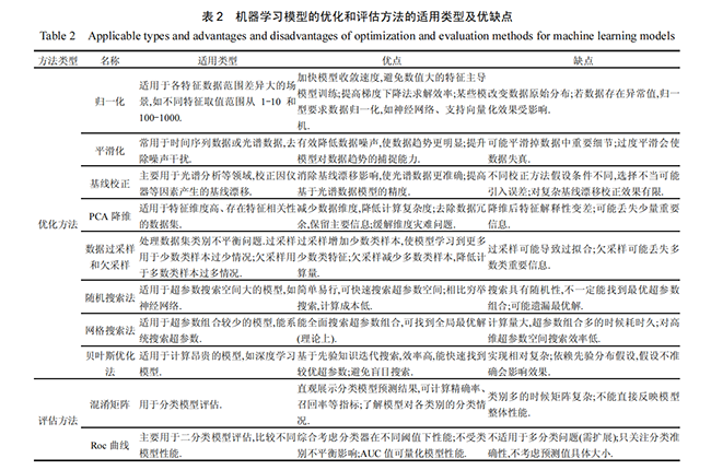 为优化和评估机器学习模型性能,研究者常采用多种数据预处理、超参数优化和模型评估方法。数据预处理方面,归一化因其对模型训练的普遍助益而被广泛应用于各类机器学习任务,旨在消除各维度数据之间的数量级差异。常用的归一化策略包括最大最小法和均值方差法(图6a)。针对MPs频谱中常见的背景干扰、仪器误差导致的锯齿状小波和基线偏移问题(图6b,c),基线校正、平滑和小波去噪等方法对原始数据调整至关重要。对于无效特征较多的数据集,主成分分析(PCA)算法可将其转化为较小的正交主成分集(图6d),实现降维并保留关键特征信息。此外,数据扩增(图6e)有助于提高模型泛化性能、降低过拟合风险并增强模型鲁棒性。在模型训练阶段,超参数优化至关重要。研究人员通常结合交叉验证(CV)使用网格搜索、随机搜索和贝叶斯优化等方法(图6f~h)以寻找最佳超参数值。其中,网格搜索和随机搜索因其简单易懂的特性,常被用于超参数优化的初期探索。而贝叶斯优化法在处理复杂高维超参数搜索问题时优势显著,随着模型复杂度的增加,其重要性将日益凸显。模型评估方面,混淆矩阵(图6i)作为分类模型的基础评估工具,因其高使用频率而被广泛采用。Roc曲线(图6j)则主要用于二分类模型评估,通过比较不同模型的性能,其AUC值可量化模型性能。结合多种优化和评估方法的集成策略,能够取长补短,具有极大的发展潜力。表2为上述优化方法与评估方式的优缺点分析。
