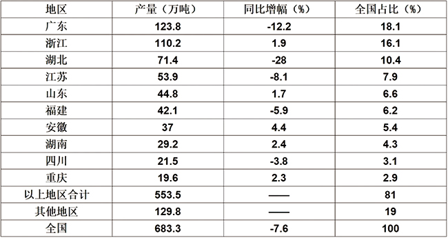 1-10月累计完成产量6557.3万吨,同比增长0.5%。从地域分布观察,产业格局正在发生静水深流般的变化。广东、浙江、湖北、江苏、山东、福建、安徽、湖南、四川、重庆位列全国产量前十,这一排名不仅延续了东部沿海地区的传统优势,更凸显了中西部省份的崛起势头。