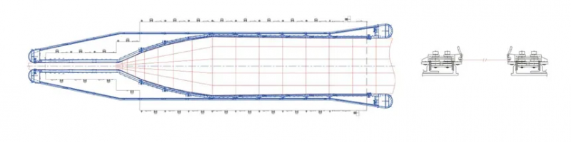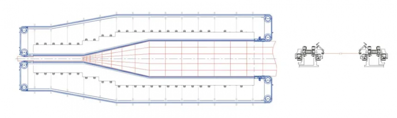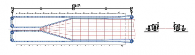 - 主要特征 各链夹配置有滚轮组沿柔性轨道运行,由八个对称分布的链盘所驱动。回程轨道外置于烘箱。薄膜在TD/MD方向的拉伸比及松弛率可精准无级调整,适合在中速运行(约250米/分)。