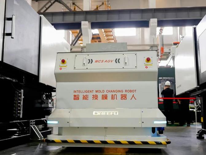 在专设的自动化单元展示区内,160SeKIII与160Se5+,现场接入智能AGV自动换模台车,完成模具快速切换、智能转运对接,适配柔性化生产需求,补齐智能物流短板,跨企业协同运转的完整系统,直观呈现东华机械涵盖主机、模具、自动化辅机及配套设备的综合整合交付能力。